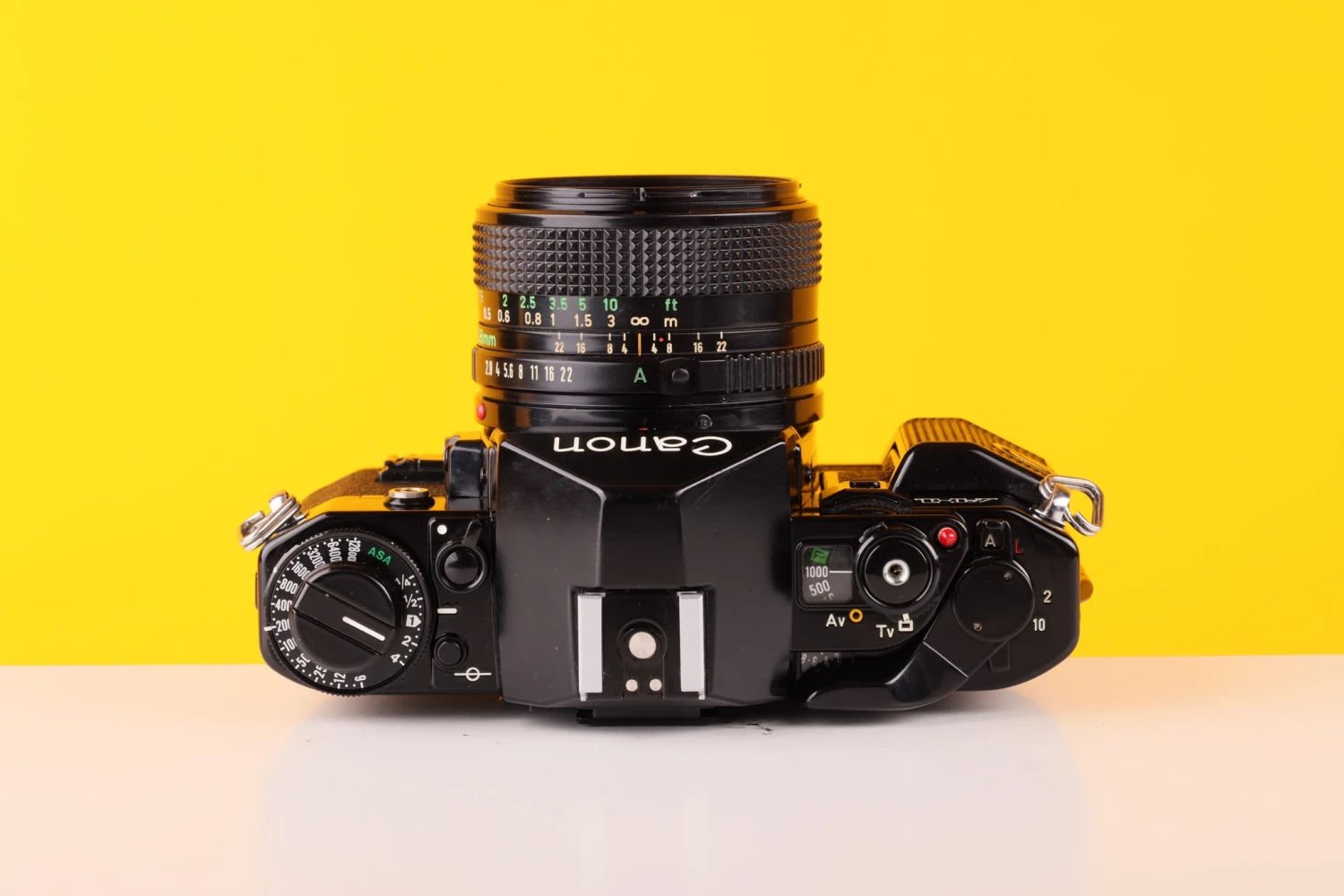 The settings dial is shown (right) set to shutter-priority auto (“Tv”). The programmed setting (marked [P] in a green square) is just past the 1/1000 mark. Rotating the collar around the shutter-release to “Av” sets aperture-priority and changes the scale from speed (black background) to aperture settings (on a yellow background). Speeds (manual or auto), or apertures (in auto mode) are adjusted by a wheel in front of the dial; the photographer’s right index finger naturally falls on this. There is a sliding cover for the wheel, preventing accidental changes to settings. The A-1 does not have a mirror lock.