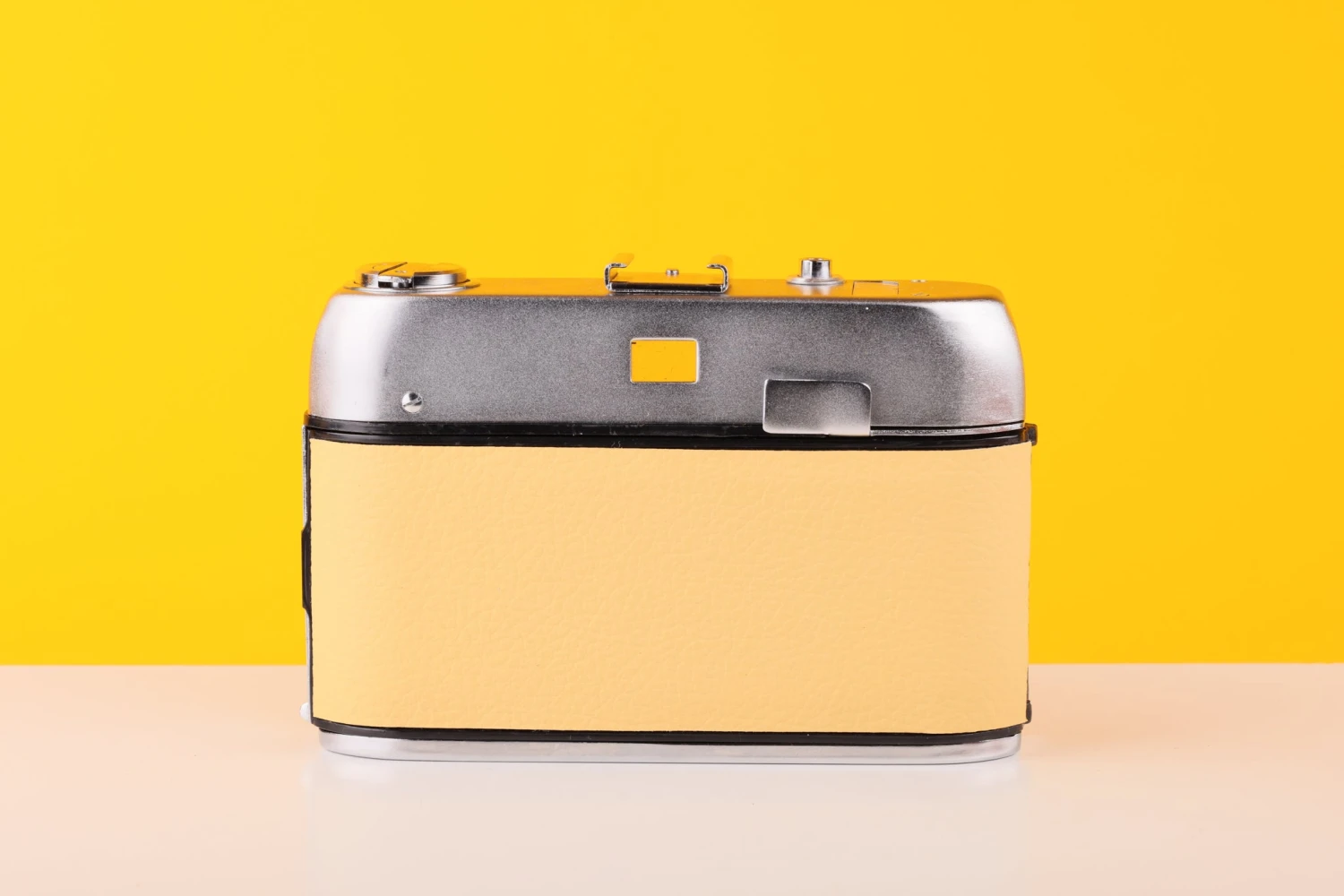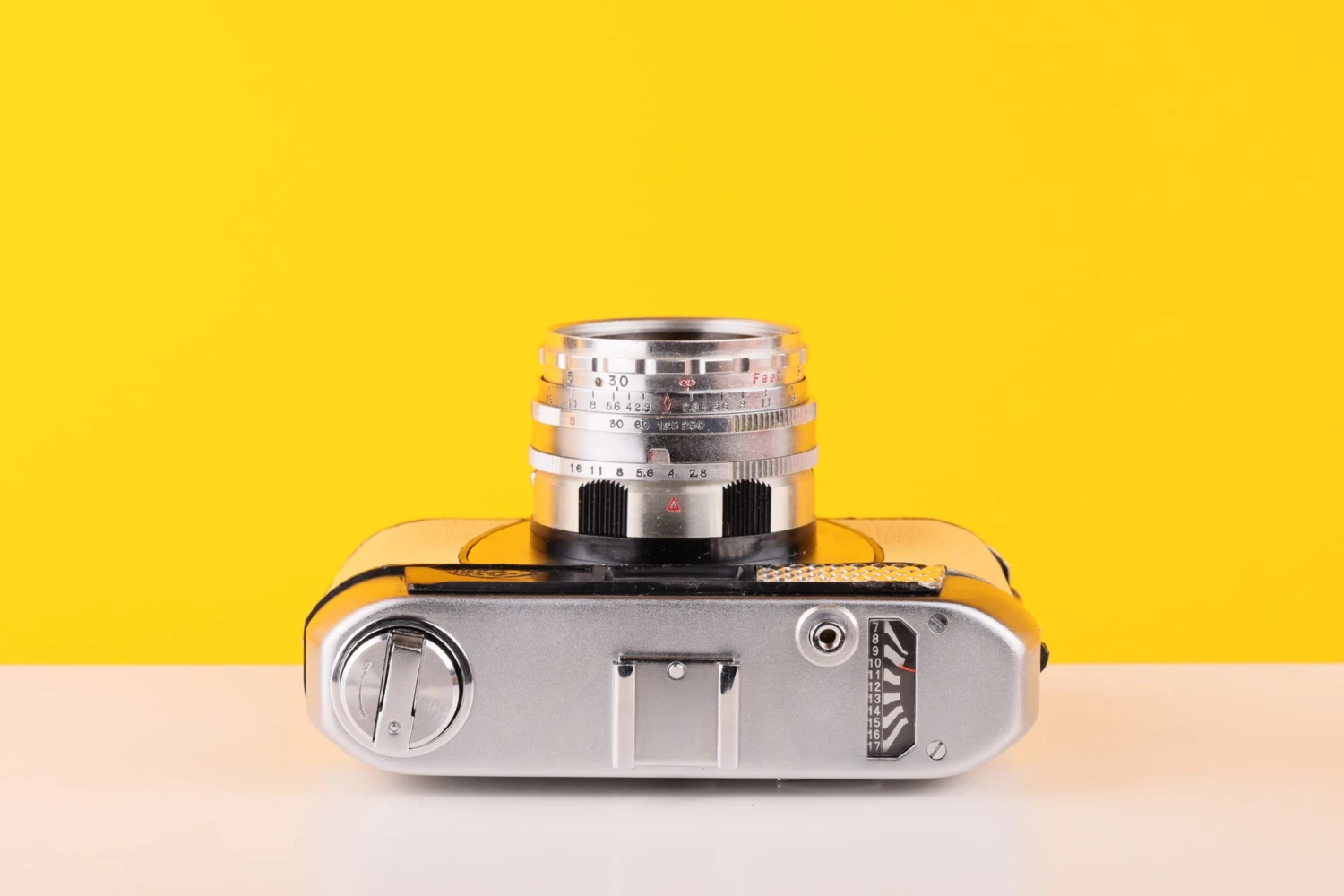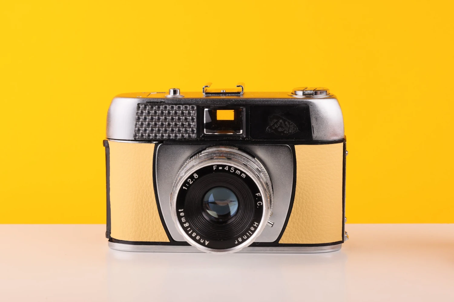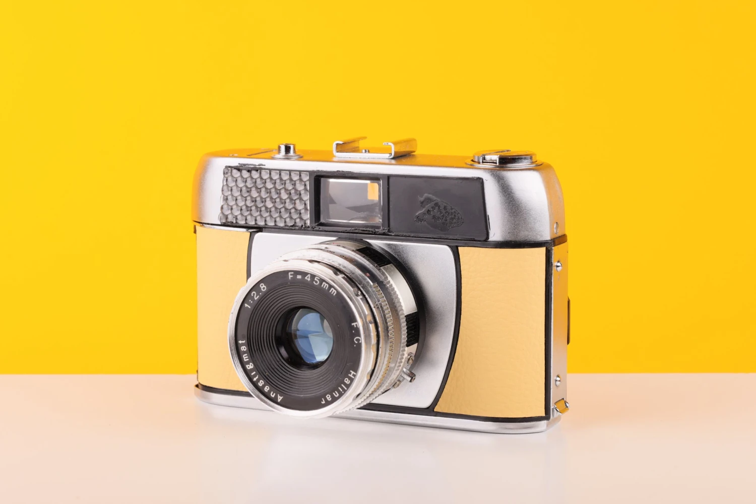 TESTED AND FULLY WORKING: Halina Paulette Electric 35mm Viewfinder Film Camera with Halinar 45mm f2.8 F.C. Lens in Light Yellow