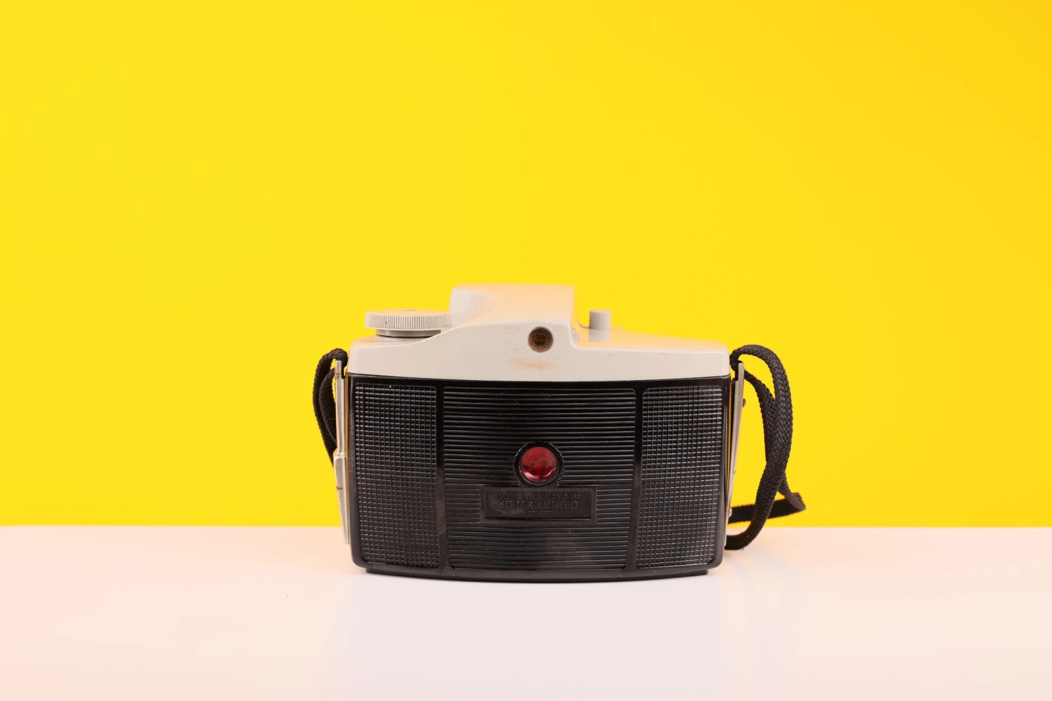 This was the last Brownie Cresta model manufactured. It was redesigned with a more angular style moulded plastic body, a grey top, plain lens panel, and a change from a glass Kodet to a less expensive acrylic Dakon lens with two apetures. Like it’s predecessors, the Cresta and Cresta II cameras, it used 120 film for a large 6cm X 6cm negative image though camera shake can be problematic because of the relatively slow shutter speed.