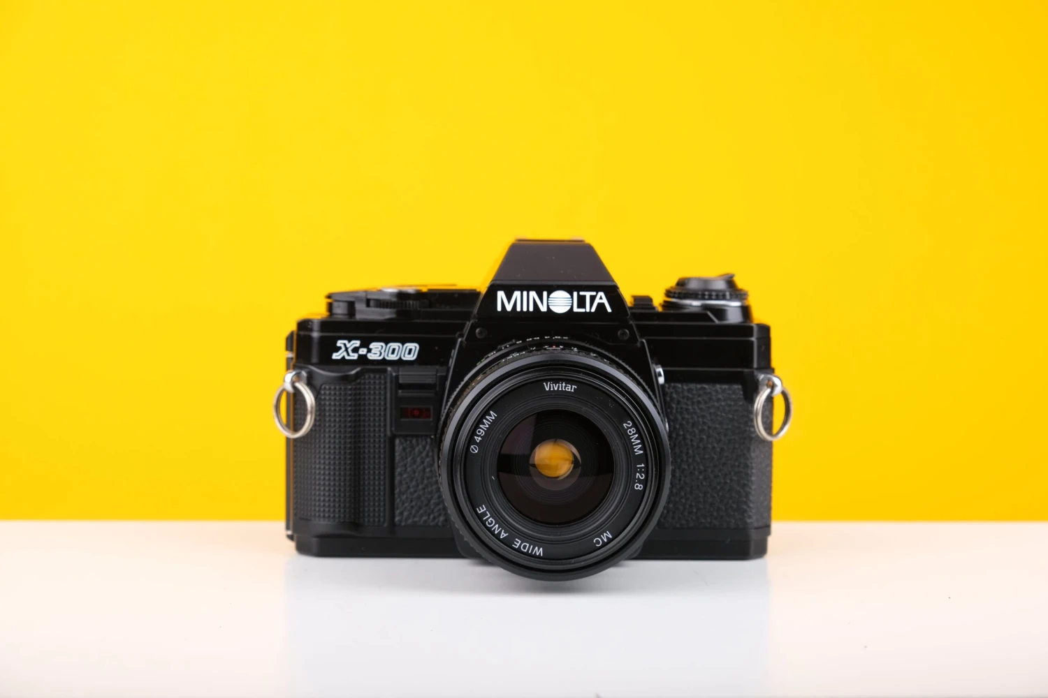TESTED AND FULLY WORKING: Minolta X-300 35mm Film Camera with Vivitar Mc 28mm f2.8 Lens