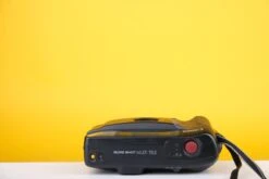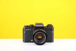 The Olympus AM-100 (Infinity S in the US) of 1987 is a fully automatic compact film camera that used 3-point zone focus to keep the price lower than autofocus rivals. Buttons on the front alter the focus distance from the fixed medium to a close-up (0.5-1m) or infinity. This camera was known as the “Picasso Petit” in Japan.