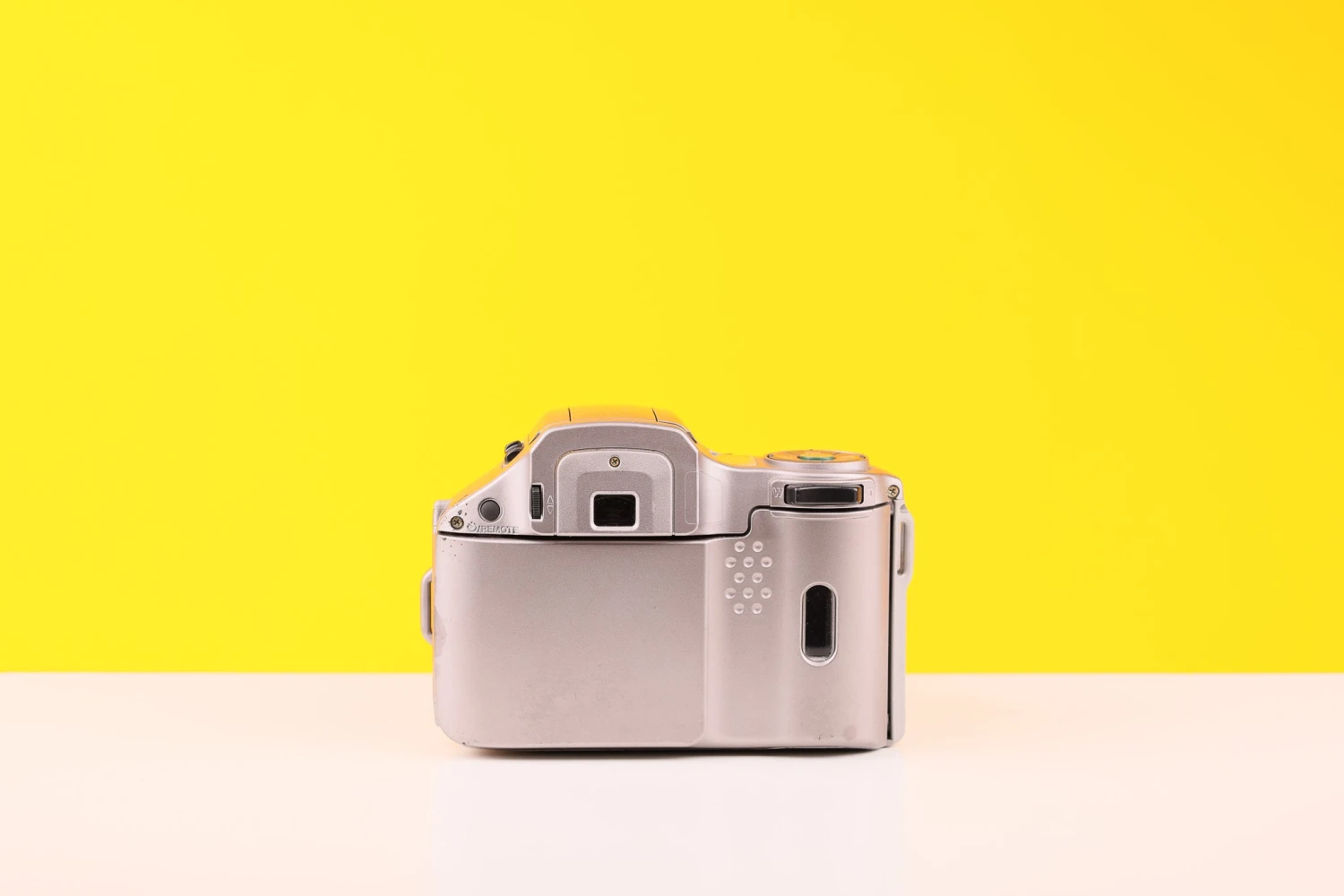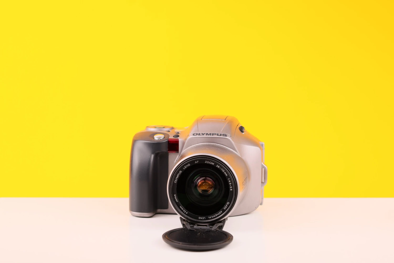 The Olympus iS-200. Although it has the versatility of a 4x zoom lens, it remains very compact and weighs only 640 g. To simplify handling further, it is also the first SLR with an integrated lens cap with the convenience of opening automatically when the power is turned on. The large-diameter aspherical lens has a high resolution that ensures outstanding quality, and the 28-110 mm zooming range is suited to almost every situation encountered in leisure photography. The wide-angle 28 mm setting is ideal for indoor shots and expansive landscapes, while the telephoto settings up to 110 mm are perfect for natural-looking candid photography and striking portraits.
