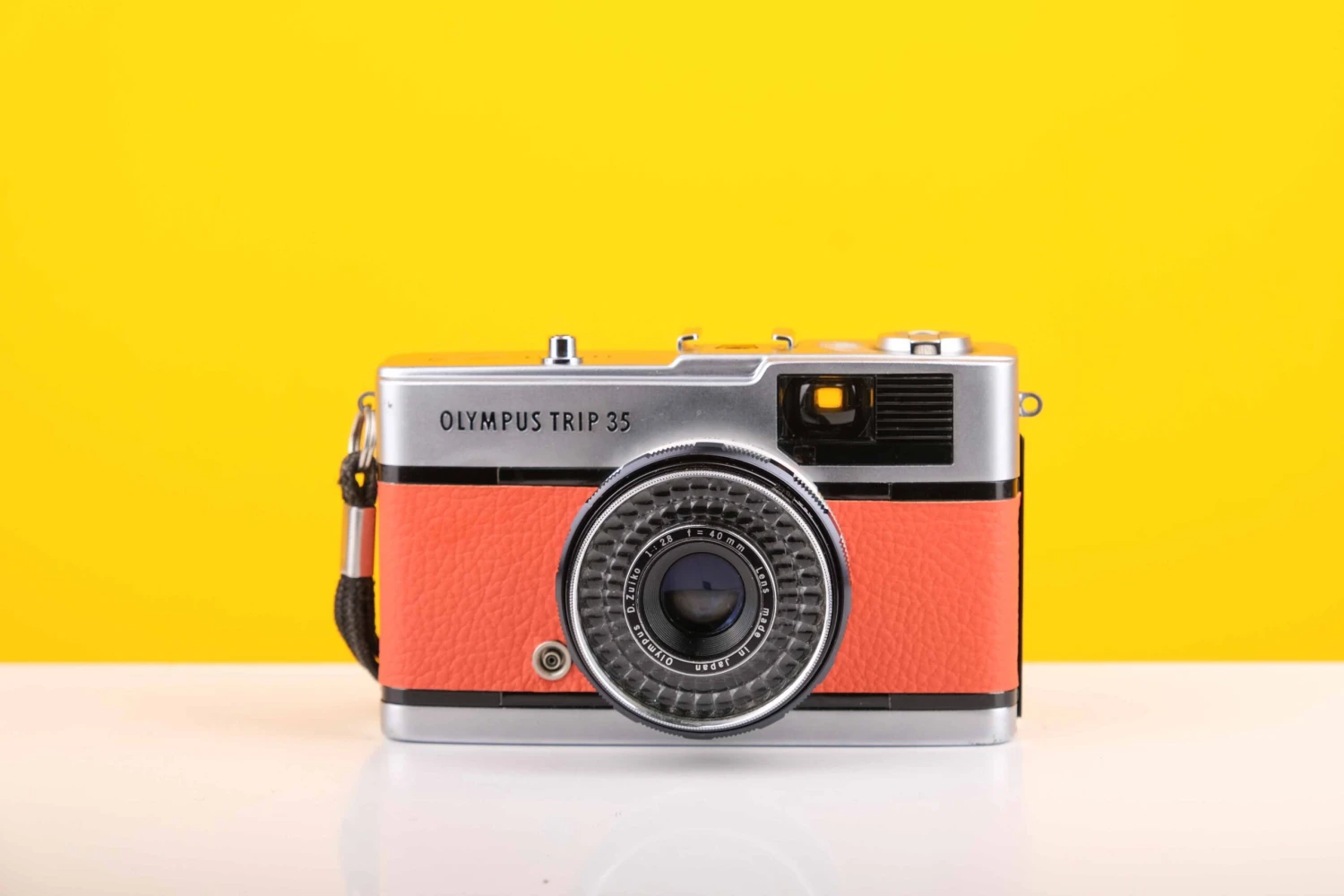 TESTED AND FULLY WORKING: Olympus Trip 35 Vintage 35mm Film Camera with Zuiko 40mm f2.8 Lens and New Orange Leather Skin
