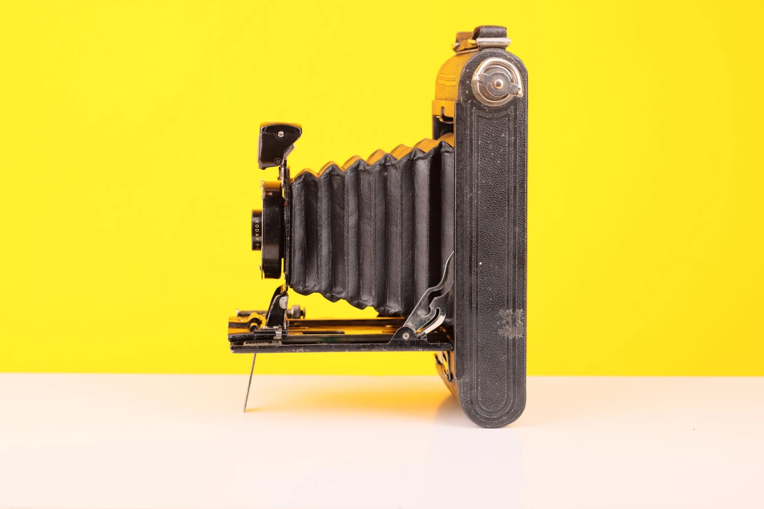 The camera uses 120 film and it has an autographic back which means that it is a data back of the Twenties. You open the back door and do your engravings.